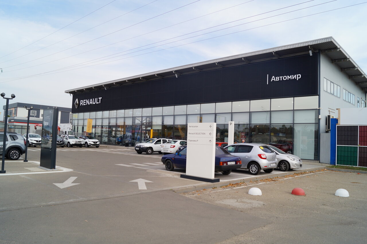 Автосалон «Автомир, Renault» — официальный дилер Renault в Краснодаре, предлагающий широкий выбор новых и подержанных автомобилей с пробегом. Компания располагается по адресу: Ростовское шоссе, 22/7, и работает ежедневно с 08:00 до 20:00.