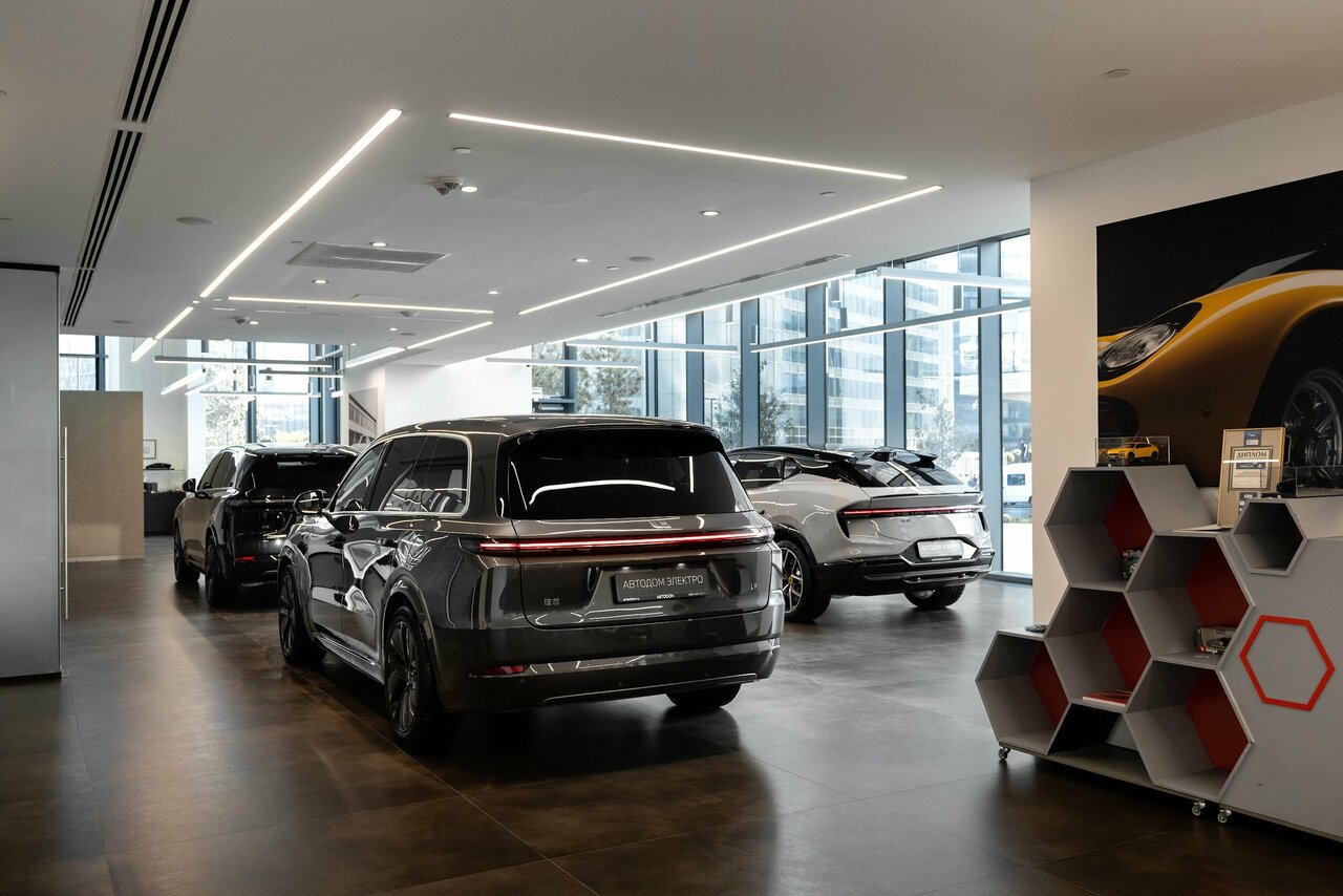 - Красивый салон с яркими автомобилями.