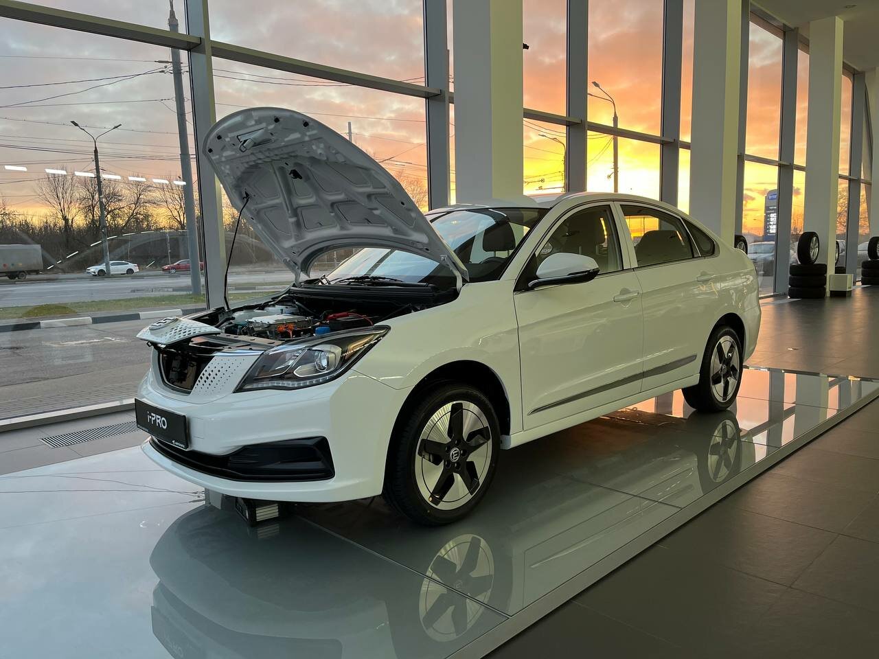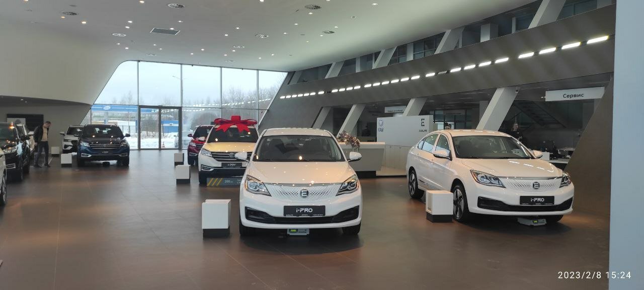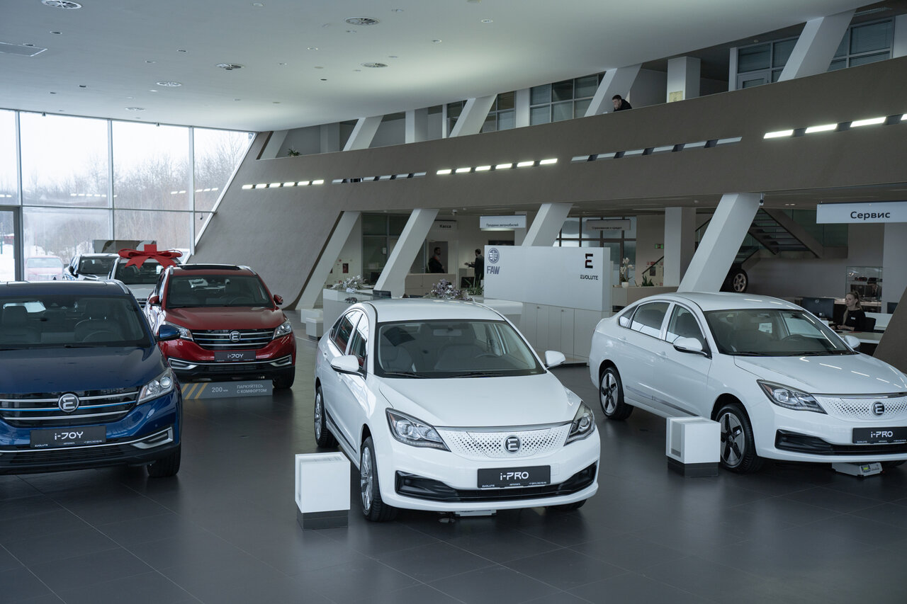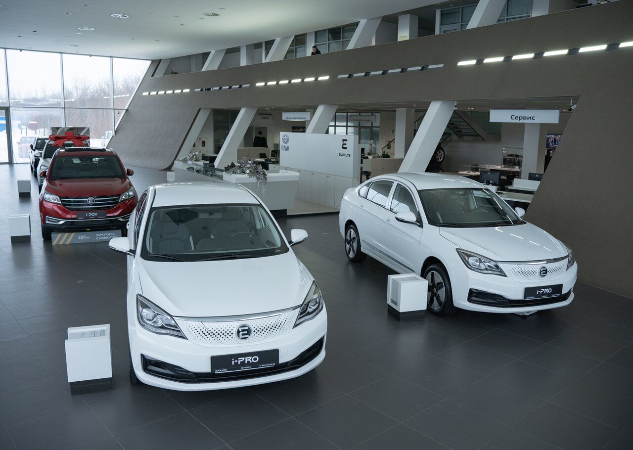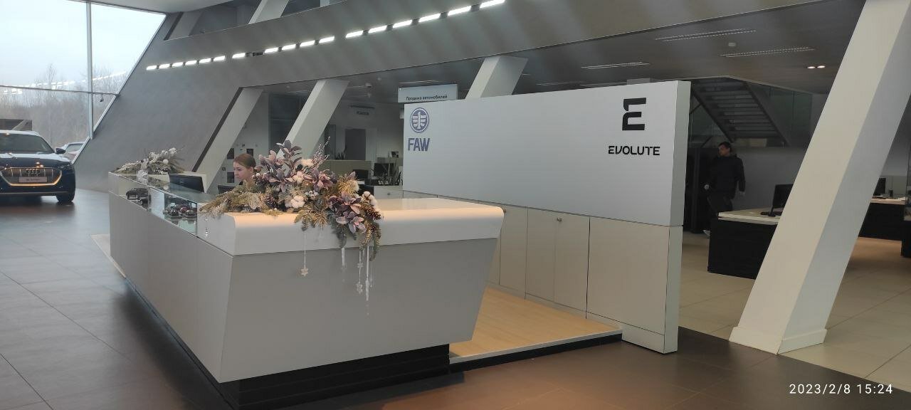 Автосалон Evolute в котором нет автомобилей. Одинокий седан скучает при входе. Надеюсь завод раскачается.