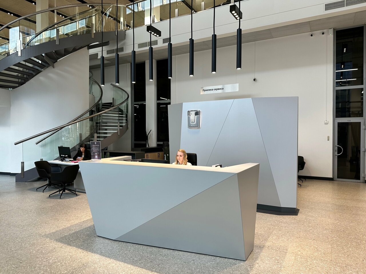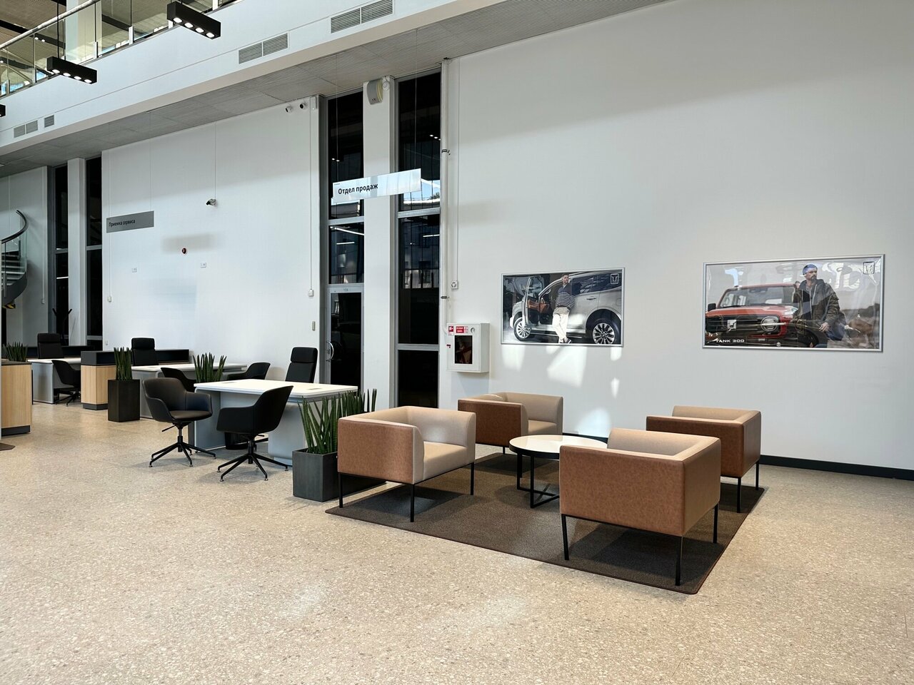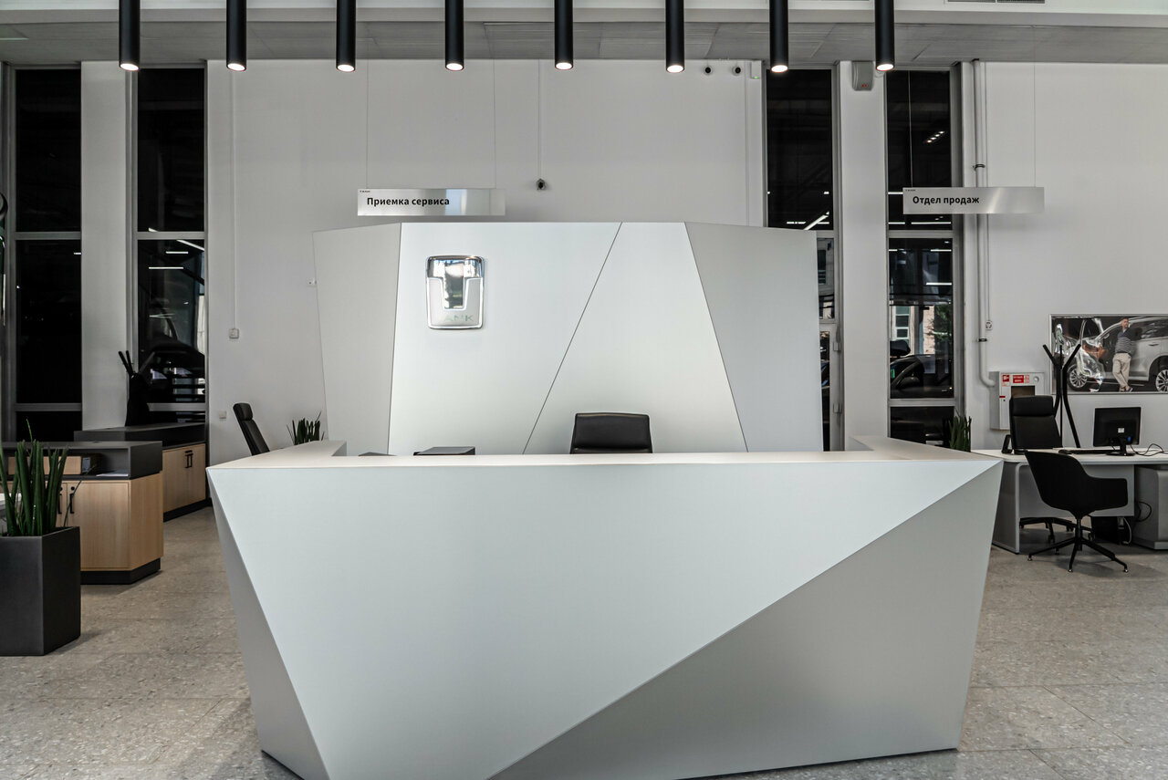 Сразу видно, что салон делался для нормальных машин пользующихся спросом, а теперь с китайским ассортиментом явно не у дел, так заходишь на первый этаж и …. иди мимо пустой стойки ресепшена на второй, т.к. на первом никого от слова совсем, ну, кроме опять же пустых столов с компами, поэтому если нужно что нибудь, сразу по лесенке на второй, там возможно кто нибудь да будет.