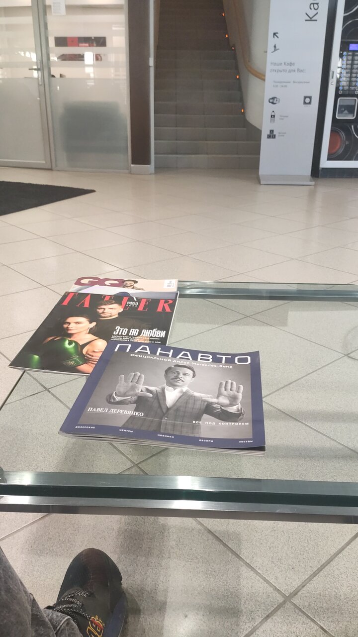 Все красиво, чисто, спокойно. Блестит и сверкает. Из кафе — вид на ремзону, можно наблюдать за своей машинкой) Всё соответствует статусу Мерседеса. И чашечка ‘капучино’ за 350р в том числе)) Но! Очень долго ждать! Потерянный день. Знали бы, уехали сразу и потом вернулись.